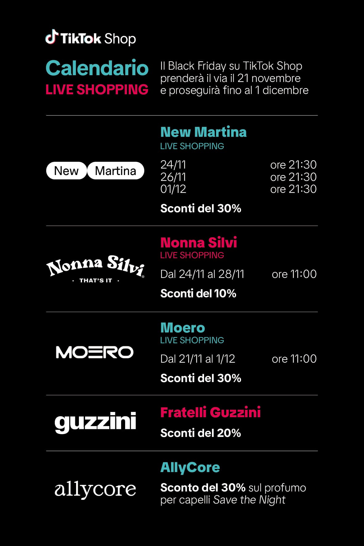 La settimana del Black Friday partirà il 21 novembre e proseguirà fino al 1° dicembre, con una programmazione fitta di offerte e promozioni. Per aiutare gli utenti a orientarsi, TikTok Shop ha preparato un calendario dedicato di dirette: veri e propri show in cui creator e brand mostrano le migliori occasioni. Tra i protagonisti ci saranno realtà molto seguite come New Martina, Nonna Silvi e Moero, pronte a presentare dal vivo prodotti e sconti esclusivi in sessioni dinamiche e altamente interattive.